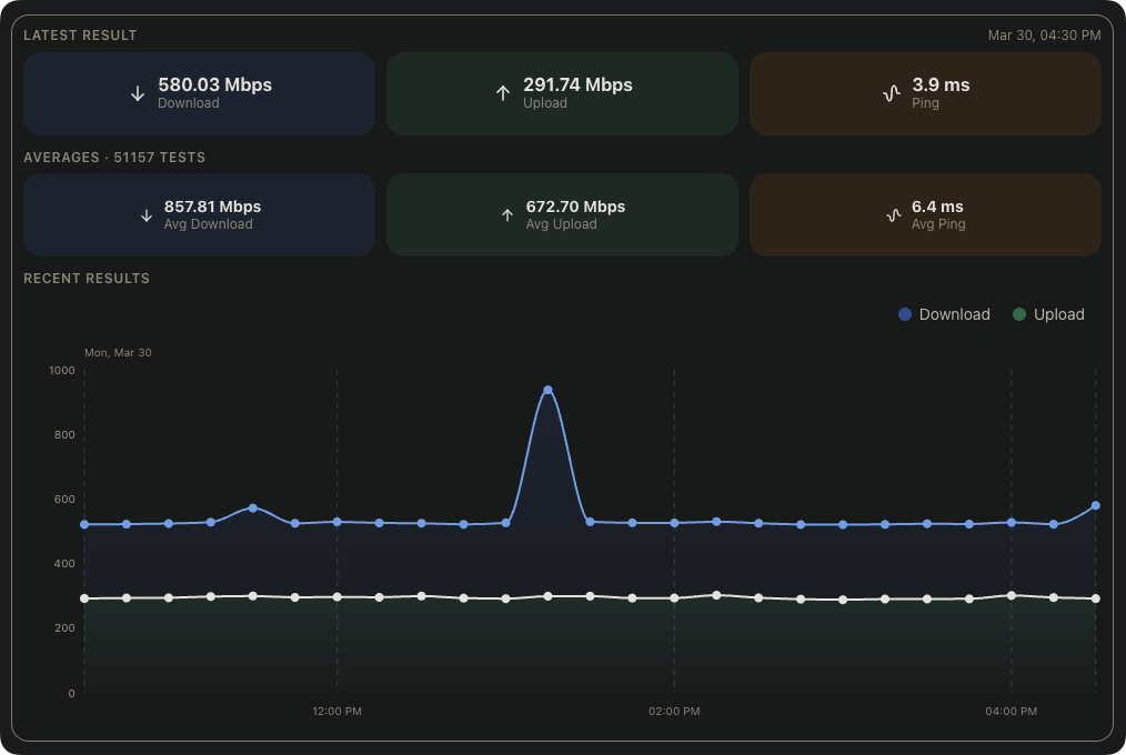 This widget displays internet speed test results from your Speedtest Tracker instance, including the latest result, historical averages, and a live chart of the last 12 hours.